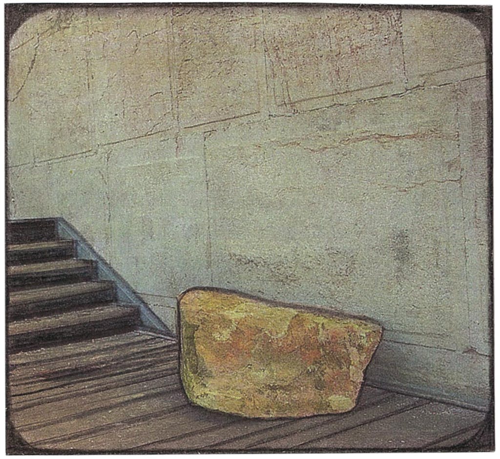 Esse véu de transparência que o colorido preto preserva atribui um aspecto líquido para as manchas, reforçado por suas formas orgânicas e maleáveis. É curiosa, nesse sentido, a única obra de Strobl que encontrei na qual a mancha é branca. A impressão é completamente diferente, ela possui um peso, uma materialidade, que parece quase errado chamá-la de mancha. Isso se deve, também, ao fato de que está contornada de preto, o que parece quase uma necessidade do artista diante desse objeto oval branco e sua opacidade, como se o branco não pudesse estar ali como mancha líquida, precisasse de seus limites sólidos. Olhando mais atentamente à imagem, percebo que o objeto branco foi colado e não desenhado diretamente sobre o papel, o que reforça ainda mais as diferenças entre o lápis preto que encobre elementos e o papel branco que os tapa.