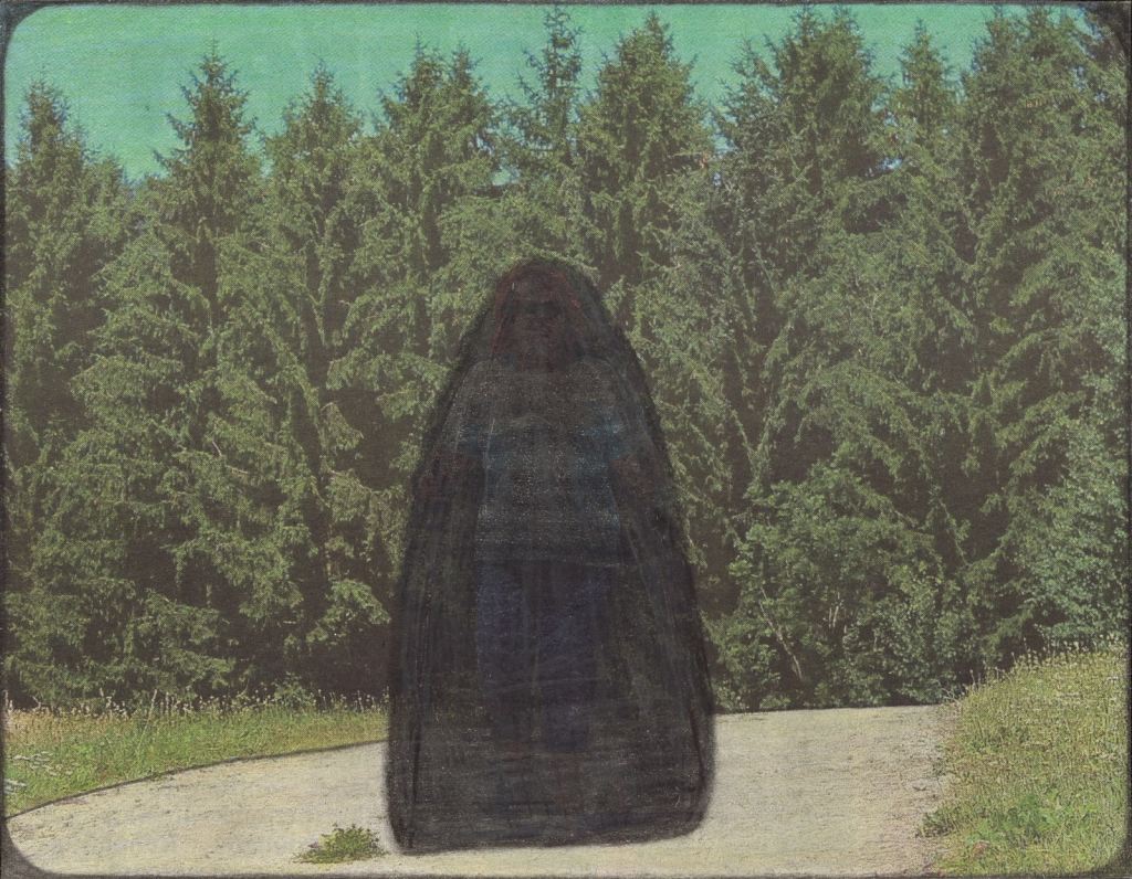 Com o preto, Strobl reforça algumas linhas e encobre elementos, criando novas manchas. Estas manchas por vezes parecem grandes pedras negras, por outras criaturas disformes, às vezes emolduram a imagem, outras apenas escurecem elementos pré-existentes, deixando seu contorno, e outras apenas aparentam um plasma transbordando pelo cenário. Em certos trabalhos, ainda é possível ver o que havia por trás das manchas, por exemplo a silhueta de uma pessoa, como palimpsestos. Ao mesmo tempo em que a mancha atrai o nosso olhar, também reconfigura o espaço a seu redor. Há uma carga nessa mancha negra disforme, por vezes antropomórfica, por vezes apenas indicadora de uma presença, mesmo um mal simbólico, configura um caráter sobrenatural às cenas.