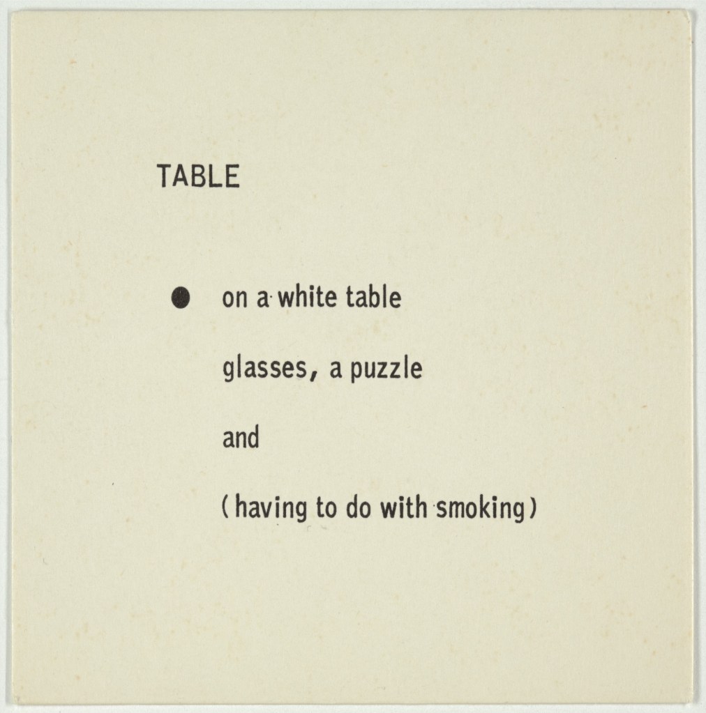A partir disto, há algumas cartelas que destacam não exatamente uma ação, mas uma apresentação de objetos domésticos que denotam também o seu processo de composição como pequenas observações tomadas no dia-a-dia. “Sink: on a white sink: toothbrushes: black soap” é como tão simplesmente o registro de uma imagem, um instantâneo fotográfico que mostra a oposição entre a pia branca e o sabão negro, semelhante à de “suitcase: black suitcase: white objects”. Em “3 Table and Chair Events”, três ações ordinárias neste espaço doméstico, em que a leitura de um jornal, um jogo e a louça disposta para refeição são dispostos. “Table: on a white table: glasses, a puzzle: and: (having to do with smoking)” trata novamente de objetos domésticos, abrindo ainda a margem de imprecisão para que o leitor seja capaz ele mesmo de definir que objeto que “tem a ver com fumar” pode estar ali presente junto, completando essa composição.