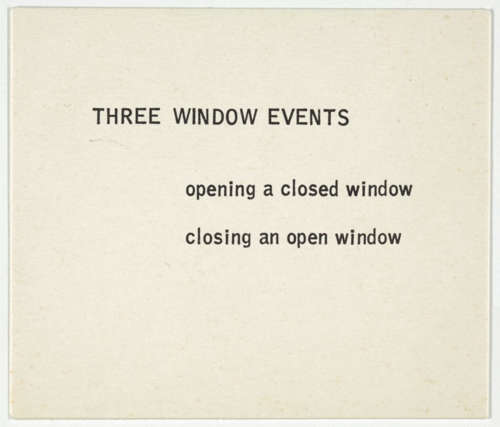 Assim é que estas proposições se tornam mais direcionadas a uma projeção do olhar, sem que se tenha de agir, necessariamente. Em “Smoke: where it seems to come from: where it seems to go to” se indica o acompanhamento do movimento desta fumaça que se desloca em um ambiente. Isto se desdobra também em “Three Lamp Events”, em que se observa um movimento nas mudanças entre estas três lâmpadas, a primeira que, de acesa, se apaga; a terceira que, de apagada, se acende; e a segunda, indicada apenas como “lâmpada”, como se tratasse de apenas destacar o objeto, mantendo uma mesma aparência, sem tomada de ação. “Three Windows” terá estrutura semelhante, mas já complexificada, apontando uma janela que se fecha e outra que se abre, restando uma terceira janela omissa neste texto, na qual (a sugestão leva a pensar) se coloca o espectador que observa as outras duas, implicando um olhar diretamente atuante como elemento centralizador destas relações. Se em “Word Event” há um “espaço negativo”, em “Three Window Events” ele definitivamente é positivo, pois enquanto o primeiro representa a pura impossibilidade de realização, no segundo ela é possibilitada exatamente pela noção imagética que o ponto-de-vista proposto oferece.