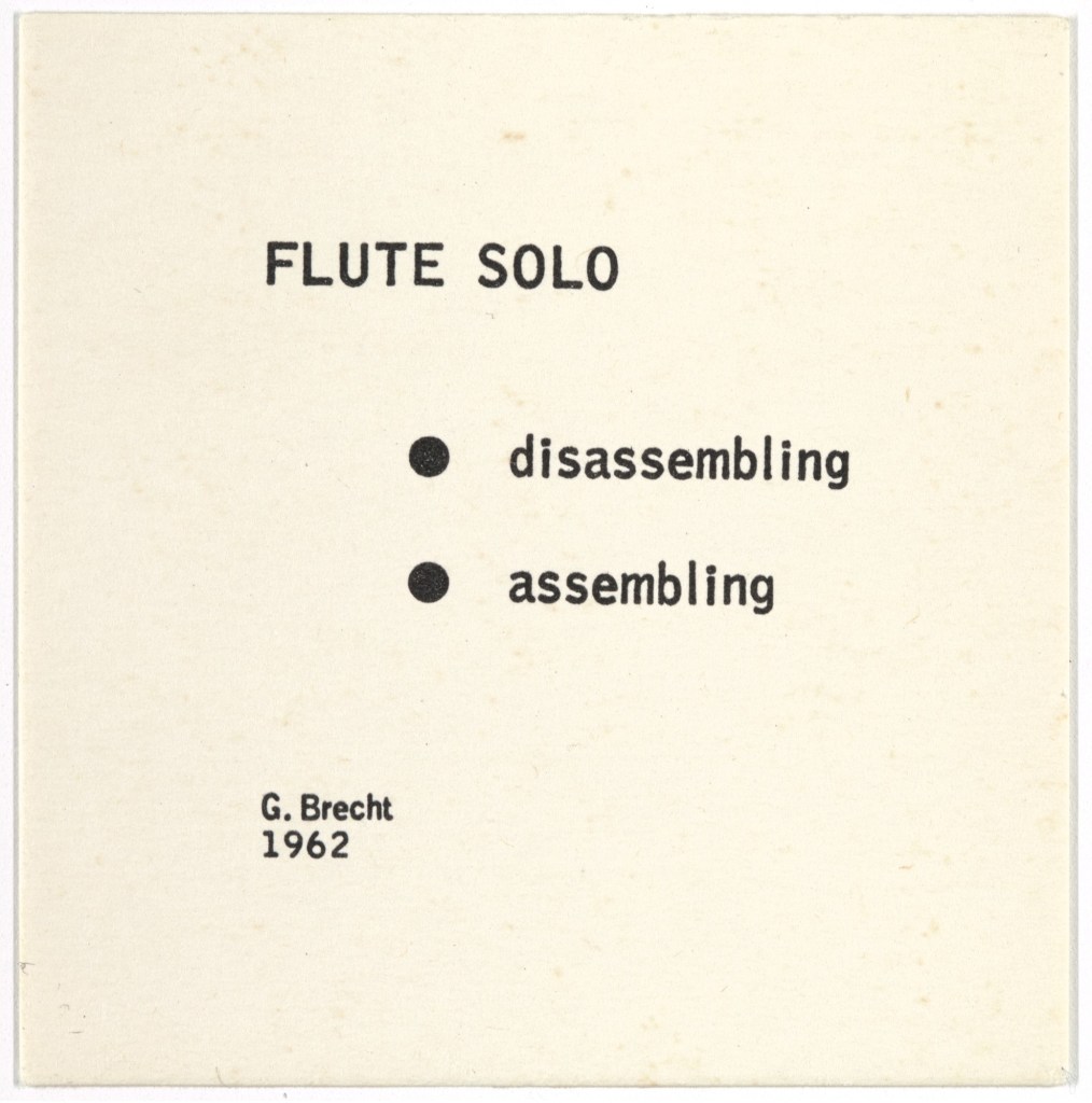 Muito do que nessas cartelas se apresenta (bem como em outros trabalhos do Fluxus) é inspirado pela experiência dadaísta do início do século e dialoga estritamente com as propostas “performáticas” de John Cage, amigo de Brecht, a partir do qual ele formulou e desenvolveu o conceito de suas “event-scores”. Esta afinidade se expressa em partituras como “Instruction: turn on a radio”, em que há um aspecto musical fragmentário, tomado do som aleatório que se emite pelo rádio, como efeito imediato do ligar e desligar do aparelho. Em outras cartelas, se impõe a destituição das funções utilitárias de determinados objetos associados à prática “performática”, como em “Flute Solo: disassembling: assembling”, em que, ao invés de se tocar a flauta, se indicam os atos de desmontá-la e montá-la novamente, ignorando completamente de sua função como instrumento musical. Algo semelhante acontece em “Piano Piece, 1962: a vase of flowers on(to) a piano”, que trata apenas de usar um piano como apoio para o vaso de plantas, tomando-o apenas como móvel doméstico, como superfície de suporte.