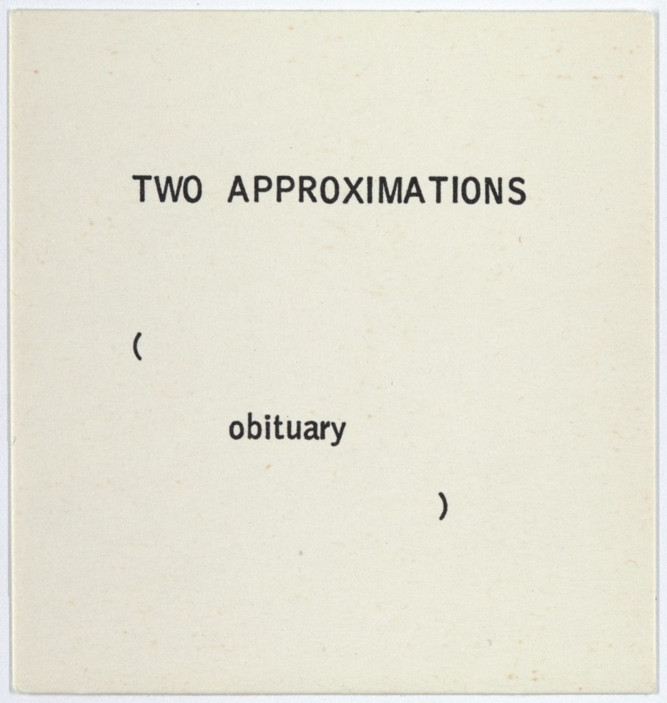 A impossibilidade do “evento” proposto se aprofunda em outros casos, como em “Six Exhibits”, em que se subverte a ideia da sala de exposição, tomando-a não como suporte para outras obras, mas como as obras em si, pela dissociação de cada um dos seus seis elementos (o teto, as quatro paredes e o chão). Esta ideia ganha continuidade em “Word Event”, em que se pretende criar um evento “da palavra”, no singular, no qual a única que se dispõe, efetivamente, a seguir, é “saída”: assim se apresenta um espaço negativo, vazio, em que se entra apenas para sair, como se somente uma placa com esta indicação ali houvesse, apontando, no limite, a uma negação da materialização do objeto artístico e do espaço de exibição em si.