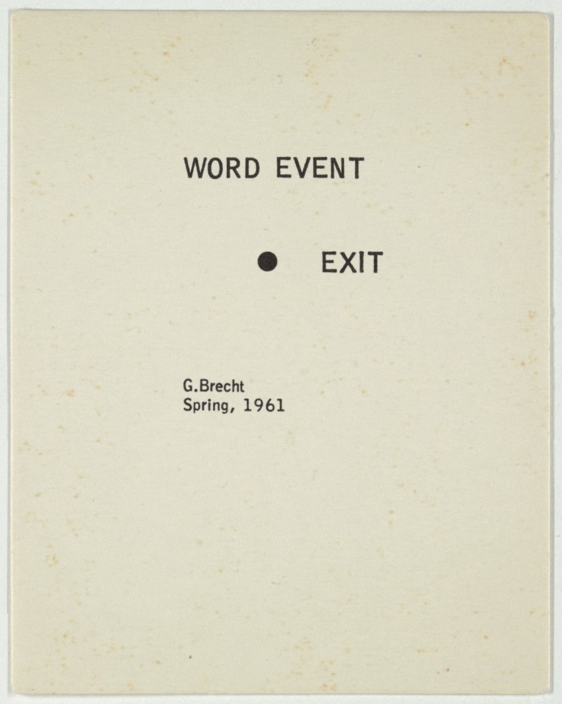 Os trabalhos mais conhecidos de George Brecht, proeminente artista conceitual americano associado ao Fluxus de George Maciunas, são as suas chamadas “event-scores” (“partituras de evento”), realizadas entre 1959 e 1963: “instruções” escritas em pequenas cartelas, cada uma delas dispondo de um título e uma proposição de ação a ser performada, a seguir, pelo seu interlocutor. A priori, estes cartões eram enviados individualmente a seus conhecidos e alguns deles recebem mesmo uma dedicatória específica para seu interlocutor, impondo um ato de leitura contingente e particularizado. Mais tarde, reproduções de todos eles serão reunidas e comercializadas em uma caixa intitulada “Water Yam”.