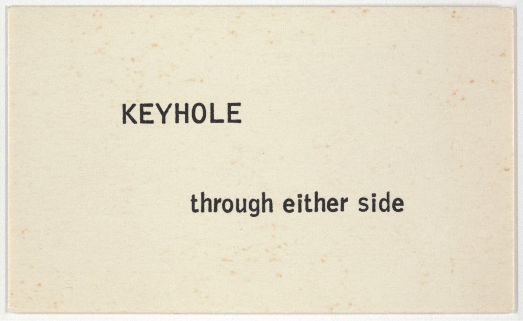 De fato, este tratamento irônico à possibilidade de performance está em “eventos” em que não apenas a ação é totalmente impossível, como é, de fato, absurda a ideia de sua proposição. “Keyhole: through either side” descreve a condição de um objeto sem qualquer tipo de ação humana que possa ser desempenhada a partir dele. “Mirror: reflecting: reflecting” sugere continuidade da ação de reflexão do espelho, evidenciando a sua existência e propondo que este objeto ordinário desempenha por si mesmo esta “ação”, como se ela não fosse simplesmente uma condição inerente a sua existência material.