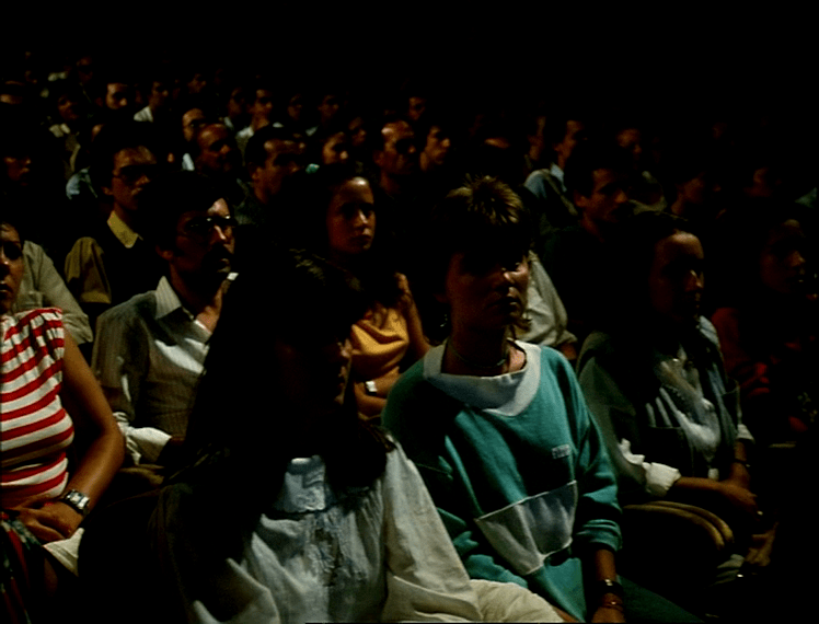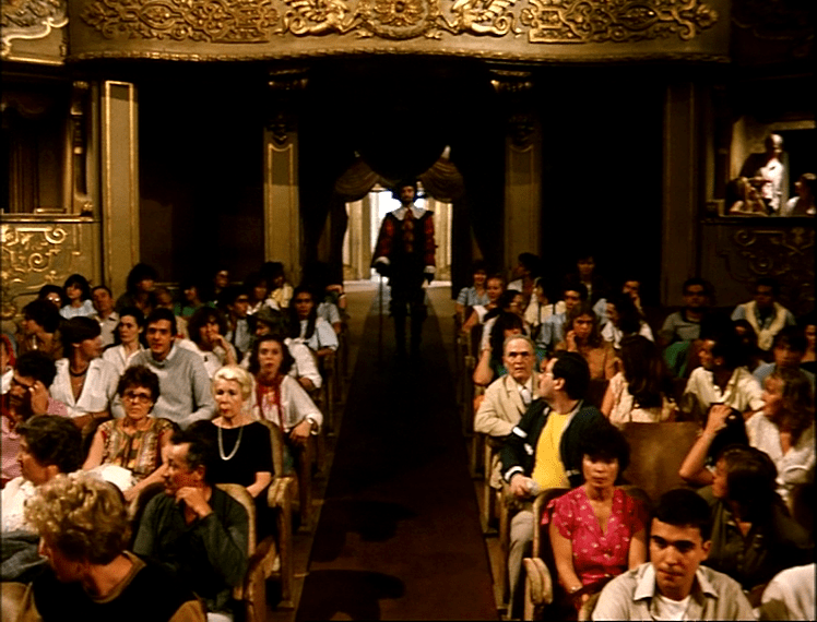 Da mesma maneira que o teatro e o cinema estão completamente conectados, a “ficção” e a “realidade”, na diegese do filme, misturam-se a partir da presença destas personagens na plateia. Este homem de vermelho, então, começa a andar e a câmera acompanha-o numa panorâmica, até que se posicione em cima do palco. O homem, neste momento, passa a olhar para a plateia (a câmera, pela primeira vez, ocupa o ponto de vista de alguém sentado nas fileiras). Olhamos para a personagem como se estivéssemos naquele espaço determinado, como se tivéssemos acabado de entrar naquele lugar junto àquelas pessoas. A personagem não só observa a plateia, como materialmente interfere nas ações desta plateia, ao pedir silêncio. Bate seu cajado no chão algumas vezes, e grita algumas outras, até finalmente conseguir o silêncio necessário para a peça se iniciar. Vemos, na parte debaixo do quadro, alguns músicos se preparando. Então, as cortinam abrem-se.
