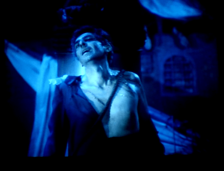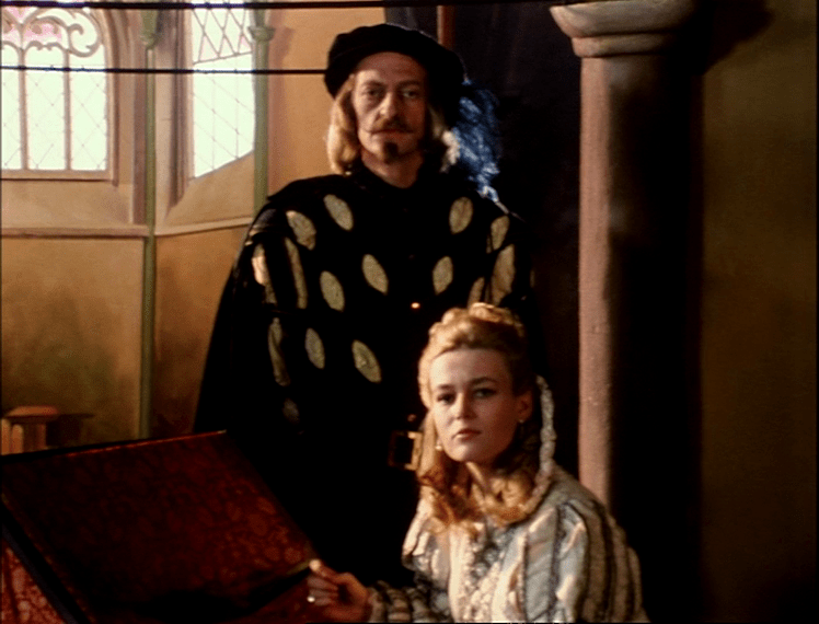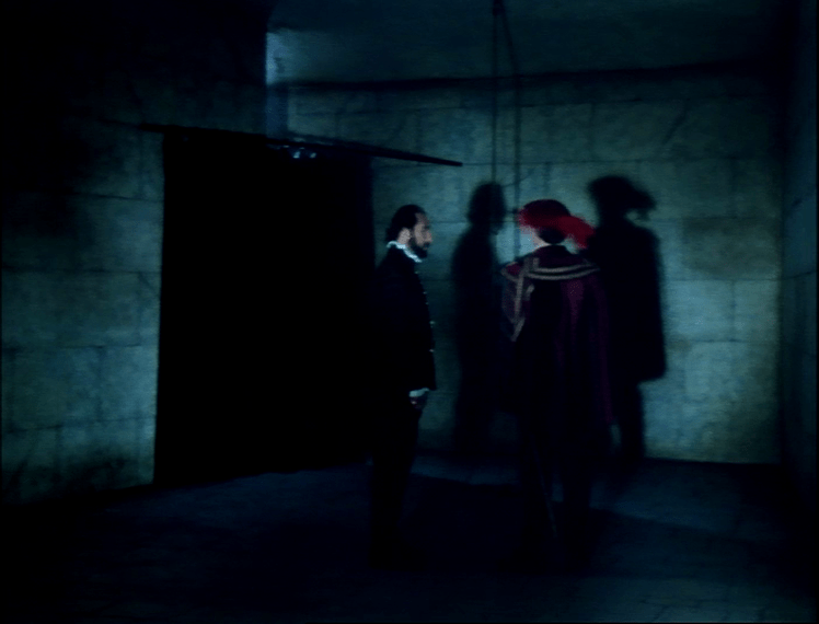 Contudo, não é somente através do distanciamento que Oliveira assinala a ligação de seu filme com o teatro. Há um aspecto que acredito que seja essencial, que é justamente a composição dos olhares das personagens. Os olhares, no cinema, são essenciais para a composição de uma montagem coerente. Um campo/contracampo minimamente aceitável deve ter as personagens olhando “para os lugares certos”. Em “Le soulier de satin“, como na maioria dos filmes de sua carreira, Oliveira não está muito preocupado em construir estes tais raccords de olhares para a coesão da montagem e da construção do campo/contracampo, simplesmente porque não constrói seus filmes a partir da utilização deste recurso. Na maior parte das vezes, os diálogos acontecem em blocos de texto corrido, com Oliveira privilegiando o plano-sequência. Estes planos-sequência poderiam muito bem ter as personagens olhando-se, mas Oliveira decide optar, ao longo dos diálogos do filme, por um olhar congelado no horizonte. É um olhar que lembra o olhar dos atores em uma peça de teatro, que olham para a escuridão que esconde a plateia. É como se as personagens em “Le soulier de satin” estivessem olhando para esta escuridão ao longo de todo o filme.