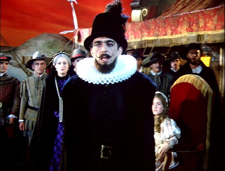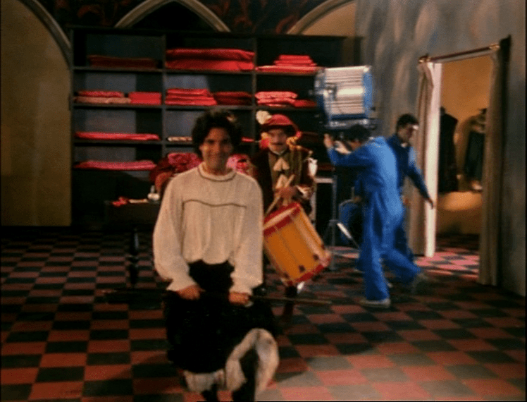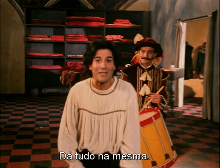 Após acompanharmos uma série de nobres conversando acerca da compra de tecidos vermelhos, enquanto as personagens que compunham a cena saíam de cena, um personagem vestido de branco entra rapidamente em quadro, sem esperar todas elas saírem totalmente. É acompanhado por um outro homem com um tambor. Começa a dizer para irem rápido e uma série de homens, vestidos de azul, passam a entrar a desmontar o cenário, passando com refletores, expondo desta maneira a feitura da peça/filme, o que há por trás daquele cena. Ao expor esses elementos de feitura, o espectador passaria a estar consciente da formulação farsesca da peça de teatro. Neste caso, do filme. Com o desmontar do cenário há, também, um evidenciamento das características artificiais e teatrais daquela cena, ainda mais com a intromissão desta curiosa personagem, que se dirige à câmera constantemente e comanda a desconstrução do cenário.