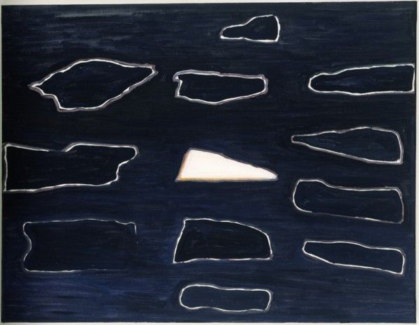 Em “Come on, play it again, Nr. 1” (2001) essa falha no sistema parece se apresentar de modo mais proeminente. Temos onze contornos brancos de formas amorfas, como nuvens ou pedras, e uma forma, no centro, totalmente preenchida de branco. Seria a peça preenchida, central, que foge à regra, ou seriam todas as outras suas imitações, tentativas de apreensão através do contorno? O que veio antes, a matéria ou a forma? O desenho ou a cor?