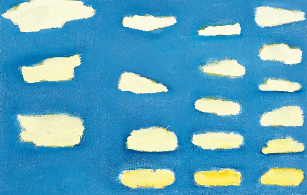Em “Retour” (2007), as “nuvens”, aqui pequenas manchas brancas, estão enfileiradas na parte direita do quadro, mas parecem gradativamente se desorganizarem à medida que olhamos para a esquerda, ao ponto de uma delas – a mais de cima, mais à esquerda – chegar a sair do quadro. Não sabemos o sentido de leitura, não sabemos se as manchas estão em movimento de organização ou desorganização – não sabemos nem mesmo se há um movimento, se essas matérias estão em vias de se tornar formas. A /nuvem/, afinal – e esta talvez seja a pintura de De Keyser que mais parece representar nuvens – é o paradoxo central da pintura, é sua impossibilidade fundadora: estabilizar, congelar em imagem, aquilo que é instável, apreender o inapreensível.