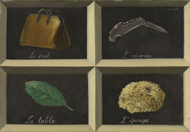 Magritte irá erguer essas cortinas de diferentes modos em sua obra, frequentemente confrontando o signo visual e textual, seja no célebre “La Trahison des images” (1928-29), com o cachimbo acompanhado da legenda “ceci n’est pas une pipe”, seja em tantas outras pinturas onde elabora um jogo entre imagem e legendas “trocadas” [5]. Em “La Clef de Songes” (1927), Magritte escolhe justamente uma esponja para ocasionar esse curto-circuito [6], objeto/animal que, como a /nuvem/ de Damisch, é composto de contornos imprecisos e cambiáveis – um animal, afinal, dos mais simples que existem, em termos de sua estrutura biológica, não possuindo sistema nervoso, digestivo ou circulatório, e cujo uso corriqueiro da palavra já é ambíguo, geralmente se referindo à sua função como objeto de limpeza de cozinha ou de banho, que raramente provém de fato do animal. Como a /nuvem/, a esponja é uma mancha nesse sistema de semelhanças, assim como o é no sistema taxonômico – ainda assim uma mancha estruturante em ambos.