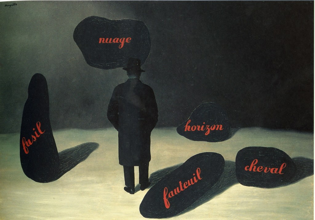 Em outros trabalhos, Magritte dispensa mesmo o uso de tal objeto ambíguo para enfatizar o descompasso entre a representação e os objetos, a “traição” das imagens, e trabalha apenas com manchas, com /nuvens/. Em “L’Apparition” (1928), por exemplo, um homem de costas e cinco /nuvens/ estão dispostos em uma superfície, cada uma assinalada por uma palavra sobreposta, “mosquete”, “sofá”, “horizonte”, “cavalo”, e “nuvem” – aqui, quem foge à regra (além da figura do homem) é, de novo, a palavra corretamente assinalada, aqui /nuvem/ e nuvem coincidem. Em seu livro sobre Magritte, Foucault comenta o seguinte a respeito do quadro: “Um objeto num quadro é um volume organizado e colorido de tal sorte que sua forma se reconhece logo e que não é necessário nomeá-lo; no objeto, a massa necessária é reabsorvida, o nome inútil é despedido. Magritte elide o objeto e deixa o nome imediatamente superposto à massa.” (p.52-53, FOUCAULT, 1988).