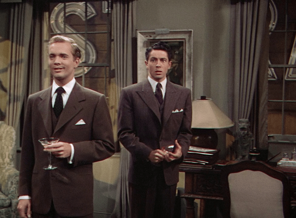 A seguir, chega o Sr. Kentley e a Sra. Atwater, tia de David que, míope, tão logo entra na sala enxerga em Kenneth a figura de seu sobrinho, enganando-se como antes se enganou o espectador e chamando-o pelo nome equívoco. A câmera, entretanto, não se engana, e nesta segunda vez o travelling ultrapassa a Kenneth, revelando Philip atrás dele e se detendo na taça de champanhe que se quebra e fere suas mãos, após um gesto impulsivo. Afinal, se esta associação não é novidade para o espectador, ela é para Philip, que se aterroriza tão simplesmente em ouvir a mulher falar o nome do morto, como se ela tivesse visto algo que denunciasse a sua presença no espaço. “Tem estudado?”, pergunta o Sr. Kentley a Kenneth, complementando após uma resposta positiva: “a semelhança é apenas física”. A seguir, lamenta a falta de comprometimento intelectual de seu filho, que só estuda “para as provas de tênis”. Logo, uma personalidade avessa às exigências de Brandon e possível motivo de seu imenso desprezo intelectual, pelo qual considera que David não merece fazer parte do círculo de relações sociais distintas que cria ao redor de si. Não restarão dúvidas, conforme identificado pelo próprio Sr. Kentley, mais tarde, que suas teorias de superioridade estão inevitavelmente associadas à “solução final” do nazismo.