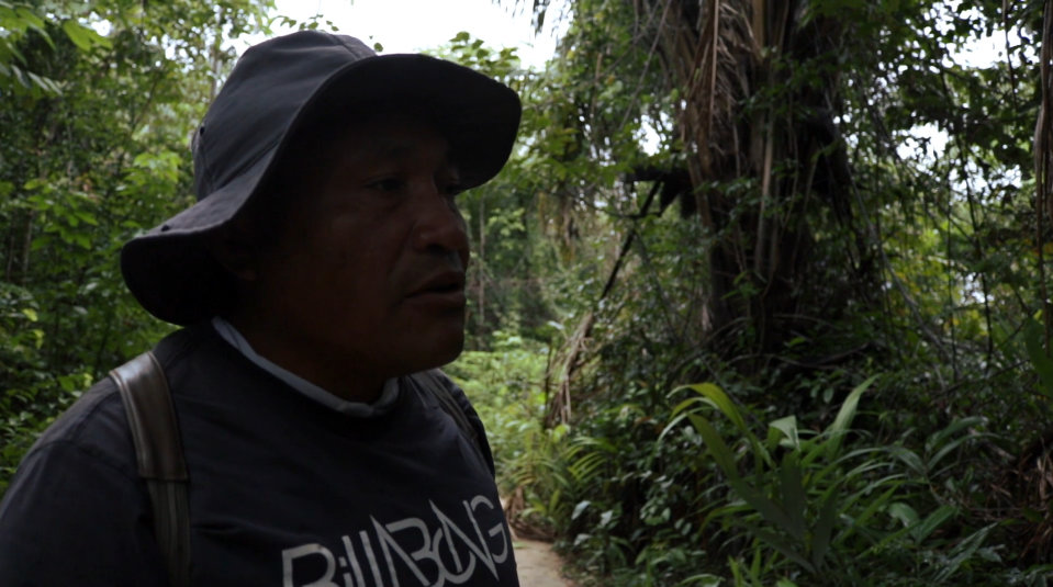 Posteriormente aos planos da mata, voltamos a ver Tachico andando pela floresta. A princípio, a câmera preserva a continuidade do plano para acompanhar o protagonista em sua trajetória de retorno à aldeia. No início do plano-sequência, Tachico está de costas; parado, ele dá um passo para trás como se aguardasse a indicação dos realizadores para prosseguir seu caminhar. Depois, já durante a caminhada, a câmera ultrapassa Tachico para filmá-lo de frente; ele, no entanto, interrompe o passo e, novamente estático, aguarda por uma indicação para retomá-lo. Neste longo plano, a dimensão dramática embebida nas palavras de Tachico se constitui de um traço “ficcionalizante” que, por outro lado, é tensionado na própria encenação: o que vemos, em linhas gerais, é a documentação do próprio processo de ficcionalização (ou encenação) do filme. Ma’e Mimi’u Haw é um documentário, uma ficção? Talvez os dois, mas não só.