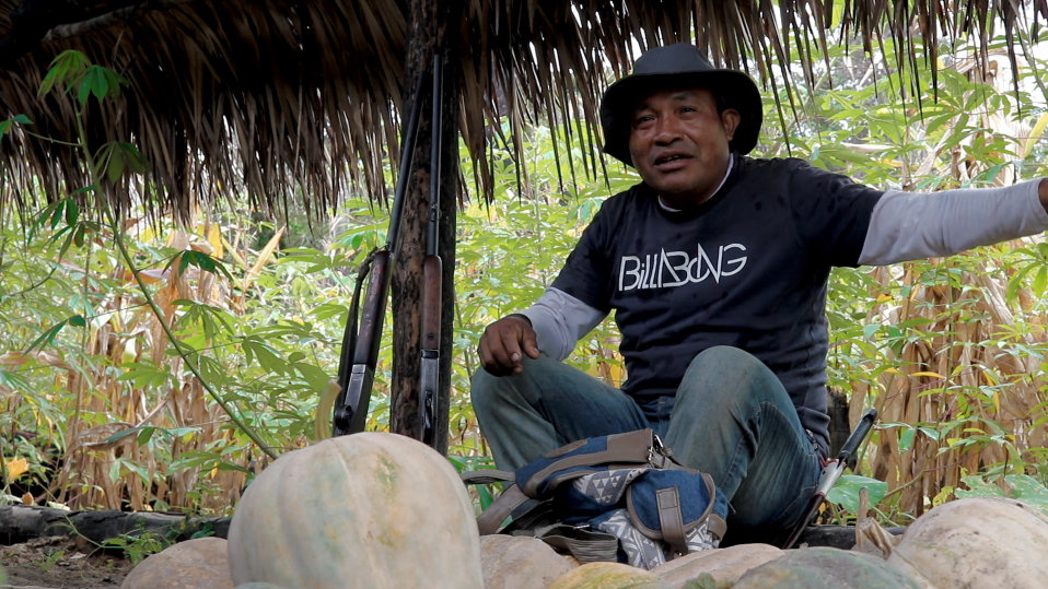 Quando da primeira aparição de Tachico Guajajara, a câmera filma em plano aberto uma fração da aldeia Guajajara. O protagonista cruza a imagem e caminha na direção da boca da mata, carregando consigo um facão na cintura e uma espingarda no ombro. O restante do primeiro ato, com exceção da última imagem que lhe põe fim, é conjurado por um longo plano-sequência: enquadrando Tachico frontalmente, a câmera acompanha seu caminhar na floresta realizando um travelling para trás.