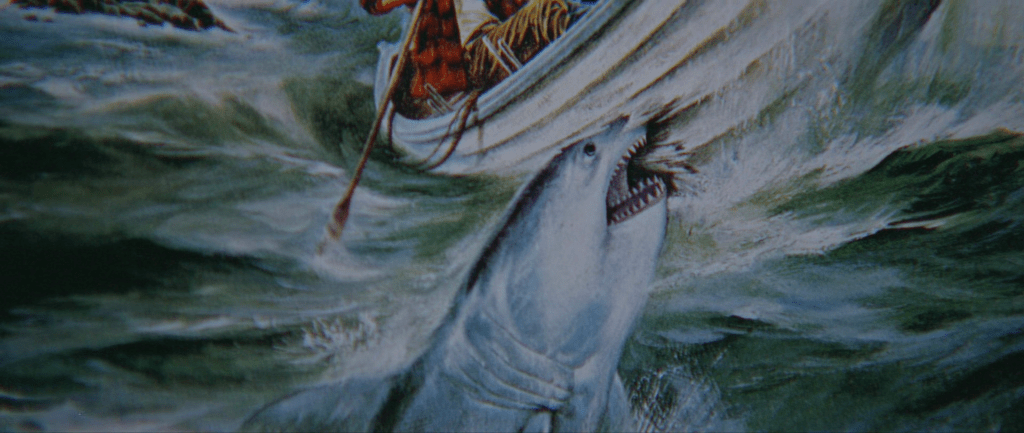 Se o próprio livro Jaws já era uma versão paperback de Moby Dick, o filme é como o livro de Melville comprimido em um blockbuster de verão – “gênero” que, inclusive, inaugurou. A baleia branca transforma-se em tubarão branco, mas a dimensão de misticismo que cerca os monstros é a mesma, assim como a delonga a revelá-los propriamente. No romance de Melville, muito se fala sobre Moby Dick ou sobre baleias e baleeiros em geral, antes de nos depararmos, de fato, com o animal concreto – aliás, a maior parte do livro é essa preparação, a baleia branca é 90% o mito do leviatã – assim como a maior parte de Jaws (tanto livro quanto filme) consiste em nos preparar para o encontro com o tubarão. Entretanto, assim como Two-Lane Blacktop é infinito ao lado de Duel, a construção mítica e concreta de Moby Dick se expande sem fim e o impulso motor da narrativa no livro é, afinal, a busca pelo desconhecido, o encontro com o outro; em outras palavras, justamente, sair do cercadinho e adentrar no vazio misterioso do mar. O tubarão em Jaws também é branco (não é preciso falar sobre a brancura da baleia, Melville já falou o suficiente [2]) e praticamente abstrato, mas é mais uma máquina do que um mito, reforçado mais por informações científicas e imagens ilustrativas do que por histórias de marinheiros e narrativas bíblicas – em Moby Dick, na verdade, temos ambos, a descrição minuciosa e taxonômica das baleias tem um papel igualmente importante na construção do mito. Enquanto o Pequod viaja quilômetros, o barco Orca em Jaws mal chega ao mar aberto. No final do filme, após explodirem o tubarão, os personagens voltam nadando à costa, e descobrimos que estavam, afinal, o tempo todo muito próximos. Mas toda essa redução não é necessariamente algo negativo: o cercadinho faz sentido em Hollywood; ele é, afinal, sua essência. Definitivamente, não se trata de uma empreitada como a de Aguirre (1975) de Herzog ou mesmo como a de Apocalipse Now (1979), mas tampouco o filme almeja tamanhas alturas [4]. Faz parte da lógica do blockbuster de verão que este terror esteja próximo ao terreno familiar dos subúrbios e pequenas cidades americanas.