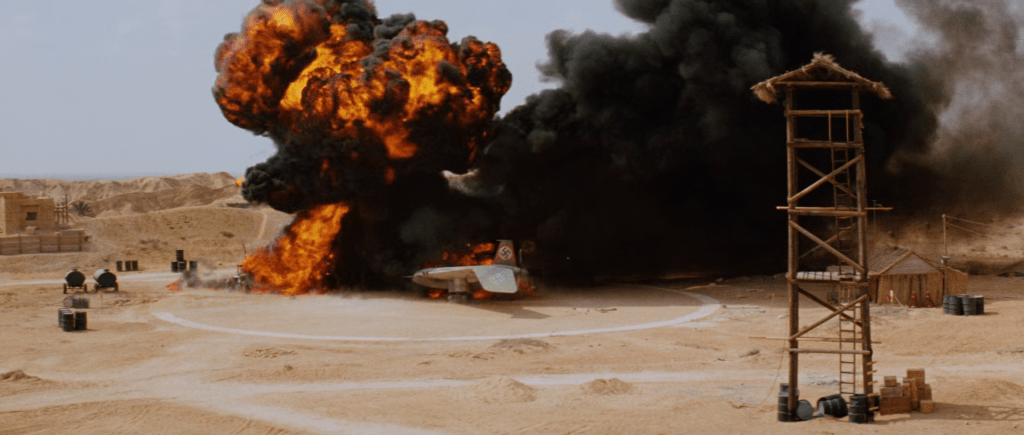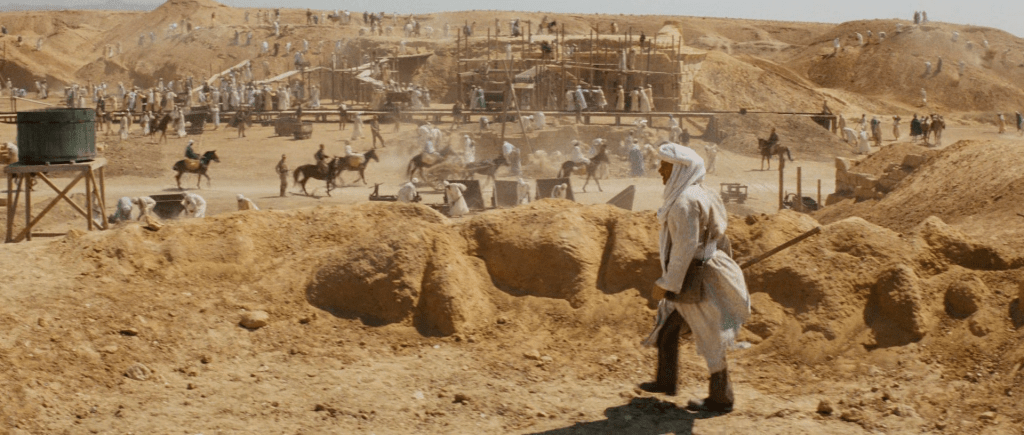 Quando as cenas não se dão em um ambiente fechado, Spielberg parece fazer questão de estabelecer limites de algum modo. Os nazistas montaram um acampamento arqueológico gigante no deserto buscando pela Arca. Indiana Jones, com seu conhecimento e experiência privilegiada, consegue descobrir a verdadeira localização da Arca, fora do acampamento. Junto a alguns homens, vai para esta nova localização onde passam o dia inteiro cavando. Entretanto, para nós, a distância real entre este local e o acampamento nazista não é nem um pouco precisa: se primeiro Jones precisa de um binóculo para encontrar o lugar à distância, quando chegam lá, o acampamento está logo atrás – e, no entanto, quando anoitece, as barracas iluminadas ao longe parecem ainda mais distantes. Esta imprecisão não chega a ser proeminente no filme; é algo sutil, mas que exemplifica o tipo de abstração operante no que diz respeito ao espaço nesse tipo de cinema que se usufrui, sobretudo, de ambientes fechados, controlados. Algo semelhante ocorre quando Jones e sua companheira Marion (Karen Allen) tentam roubar um avião do acampamento e entram em combate com um dos nazistas. A cena toda – literalmente cercada por um círculo branco demarcando a área do avião – em que várias coisas acontecem ao mesmo tempo (o avião gira em círculos, há gasolina vazando e Jones brigando com o nazista), é despercebida pelo resto do acampamento ao redor até haver uma explosão. O recurso é necessário, evidentemente, para fornecer tempo o suficiente para a cena se desenrolar sem a interrupção constante de inimigos em muito maior número, que eliminariam os protagonistas em questão de segundos, e mesmo compreensível, afinal não se trata, aqui, de um cinema que visa qualquer tipo de realismo.