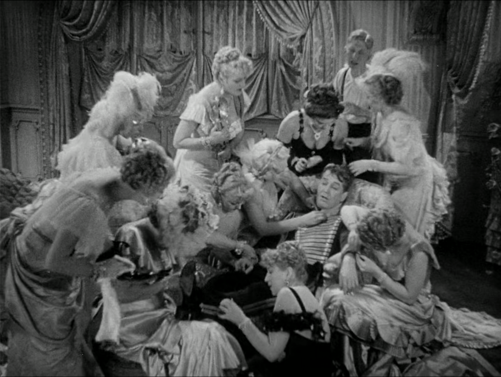 A partir deste ponto, o filme encena o conflito entre a história de amor programática, a ordem do rei para que McDonald e Chevalier se casem, a qual todos os personagens secundários conspiram para que aconteça, e a história de amor orgânica entre duas personagens que se encontraram e decidiram se amar. Irreverente, Chevalier se recusa a seguir o roteiro, agora apaixonado por Fifi, deprimido e bêbado ainda no cabaré, precisa ser arrastado por uma legião de mulheres afim de cumprir sua missão primeira: se casar com a rica viúva. Desde o cabaré até a embaixada é preparado como um ator nos bastidores, o vestem, passam perfume e o empurram para dentro do palco para ele performar seu número.