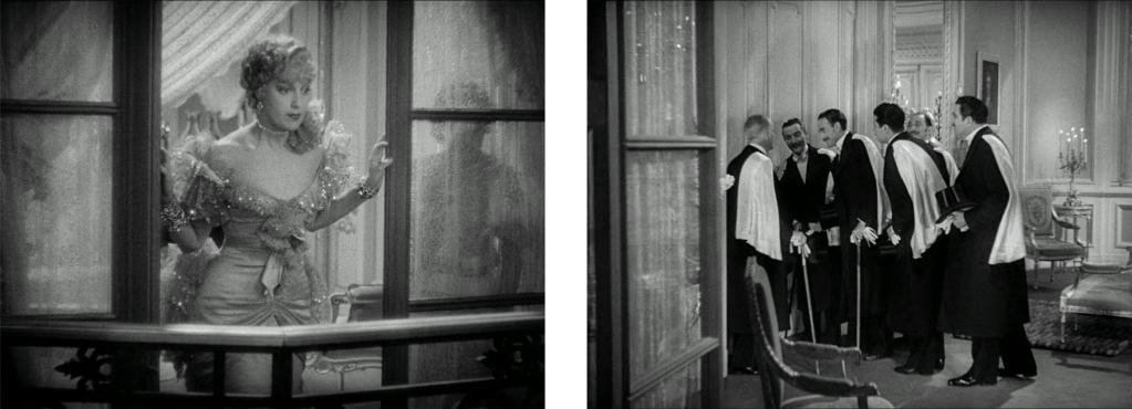 Para citar um exemplo, quando McDonald chega a Paris, ela se arruma em seu quarto, enquanto do lado de fora seus futuros pretendentes, gentlemans da sociedade interessados em seu dinheiro, esperam por ela. Aqui eles funcionam como um público, esperando sua deixa atrás das coxias (quem sabe um deles seja o escolhido e possa subir no palco principal). Mas ela escuta da janela Chevalier passando, e de sua varanda, antes palco principal, ela passa a ser também espectadora.