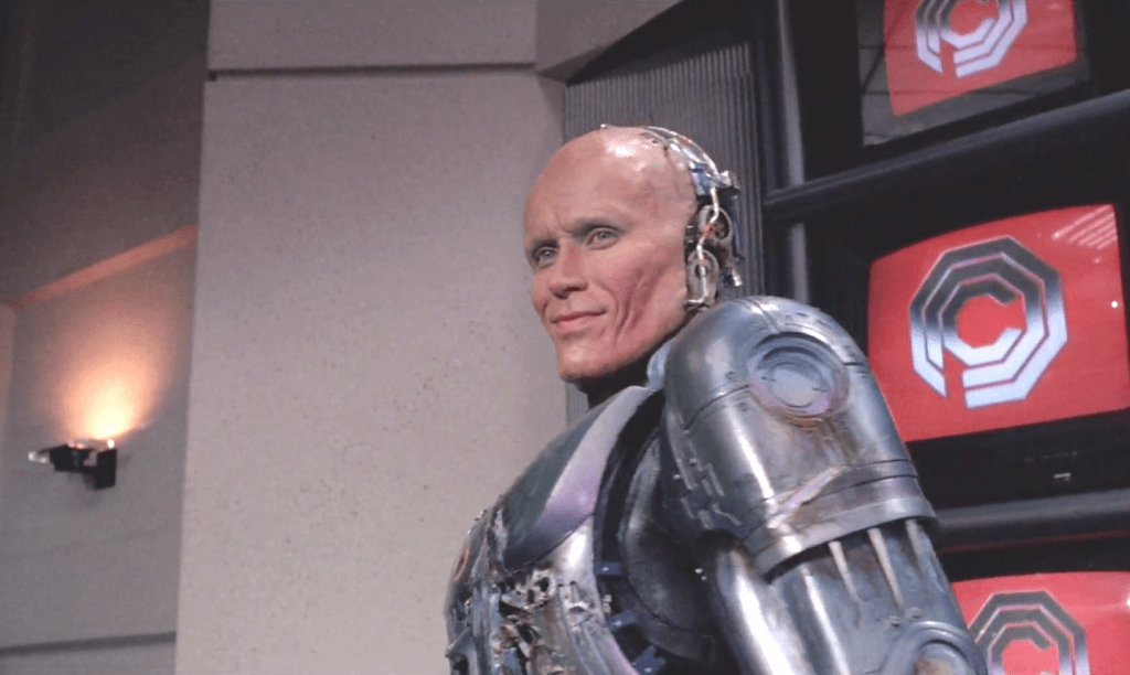 O ciborgue é regido por contratos virtuais, por lógicas capitalistas, mas sua presença, assim como aquela dos humanos que o cercam, é enfaticamente concreta. Quando ainda era humano, seu corpo frágil é mutilado violentamente, e quando robô sua lataria é rígida e pesada. O próprio filme assume esta materialidade: as inserções televisivas na trama não são sutis, mas interrompem o fluxo narrativo bruscamente. Como o ciborgue, trata-se de um filme que veste o traje metálico do cinema comercial, mas por dentro é feito de carne e sangue – título, aliás, de seu filme anterior Flesh + Blood (1985), sua estréia em Hollywood, cujo aspecto visceral é muito mais explícito, ainda não “revestido” como Robocop.