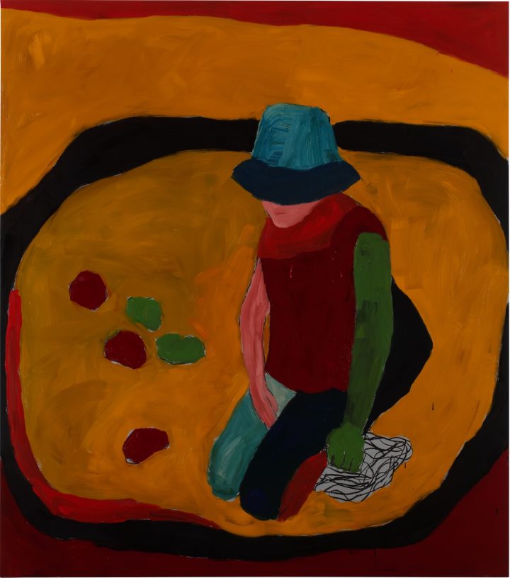 A mesa é um elemento particularmente relevante nestas composições: é o espaço onde a ação, a brincadeira, irá de fato ser desempenhada. Com frequência preenchida por um padrão quadriculado, a mesa funciona como o “tabuleiro de xadrez” [3] da pintura renascentista, estabelecido pela perspectiva, que servia de palco para os textos encenados, com a diferença de que aqui nos distanciamos levemente da cena de modo a ver quem orquestra as peças, seus bastidores, quem manipula as marionetes. Como na obra de Francis Bacon, onde figuras em movimento, transformação ou embate são cercadas por formas retangulares, como se estivessem enjauladas em caixas transparentes [4], a pintura introduz uma espécie de arena onde a ação visualmente violenta irá se concentrar.