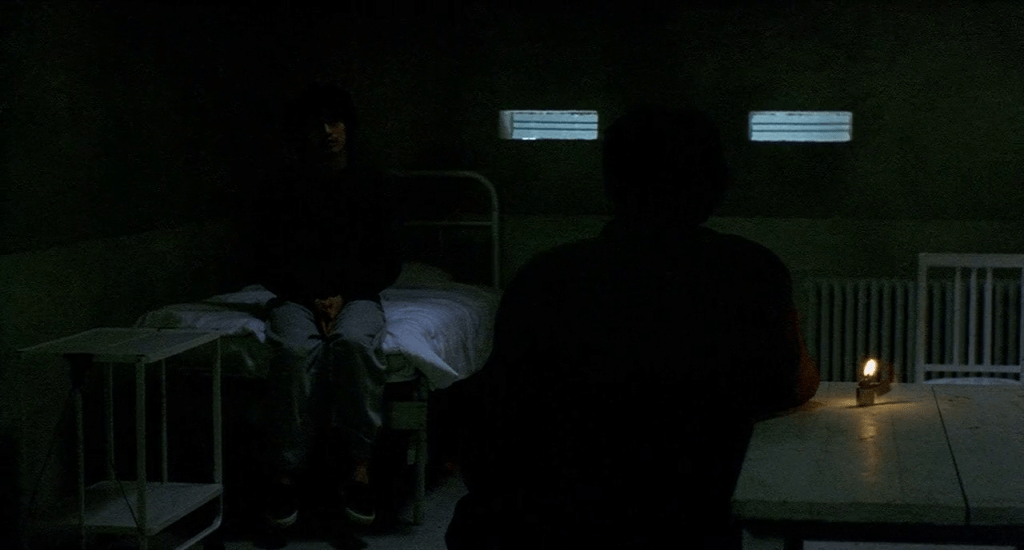 As he is taken to a hospital, the next victim will be a doctor. A scene with the character earlier already suggests certain difficulties she, as a woman, faces in her work, when a previous patient mockingly suggests that the doctor’s request for him to lower his pants would be of sexual nature. Once attending to Mamiya, we see the process we are already familiar with unfold. As he cannot light a cigarette inside the hospital, he here resorts to tap water which he uses to fill a glass. The fire, then, was just a red herring. The ritual can be done with other elements. What seems to matter is more of a constancy of sound and subtle movement. Mamiya spills the water from the glass he just filled onto the floor. The doctor follows the path of the water, as do we, now in a close plane. It drips slowly, darkening the gray floor of the room it passes through, as if it had a life of its own.